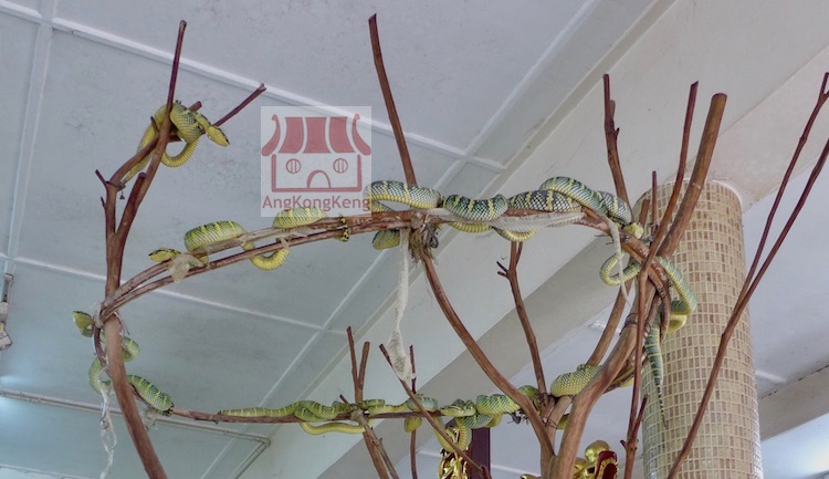 The Snake Temple is situated in Sungai Kluang, Bayan Lepas, Penang, Malaysia and is perhaps the only temple of its kind in the world. The temple is filled with the smoke of burning incense and a variety of pit vipers. The vipers are believed to be rendered harmless by the sacred smoke, but as a safety precaution, the snakes have also been de-venomed but still have their fangs intact. Visitors are warned against picking up the reptiles and placing them on their bodies to take pictures. Local devotees believe the temple's snake population comes there of its own accord.